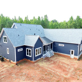 popular modern farmhouse front facade with smoky blue lap siding and stained front door