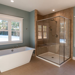 Upstairs, the master bedroom has a custom walk-in closet and master suite with granite countertops, freestanding tub, and semi-frameless shower enclosure.